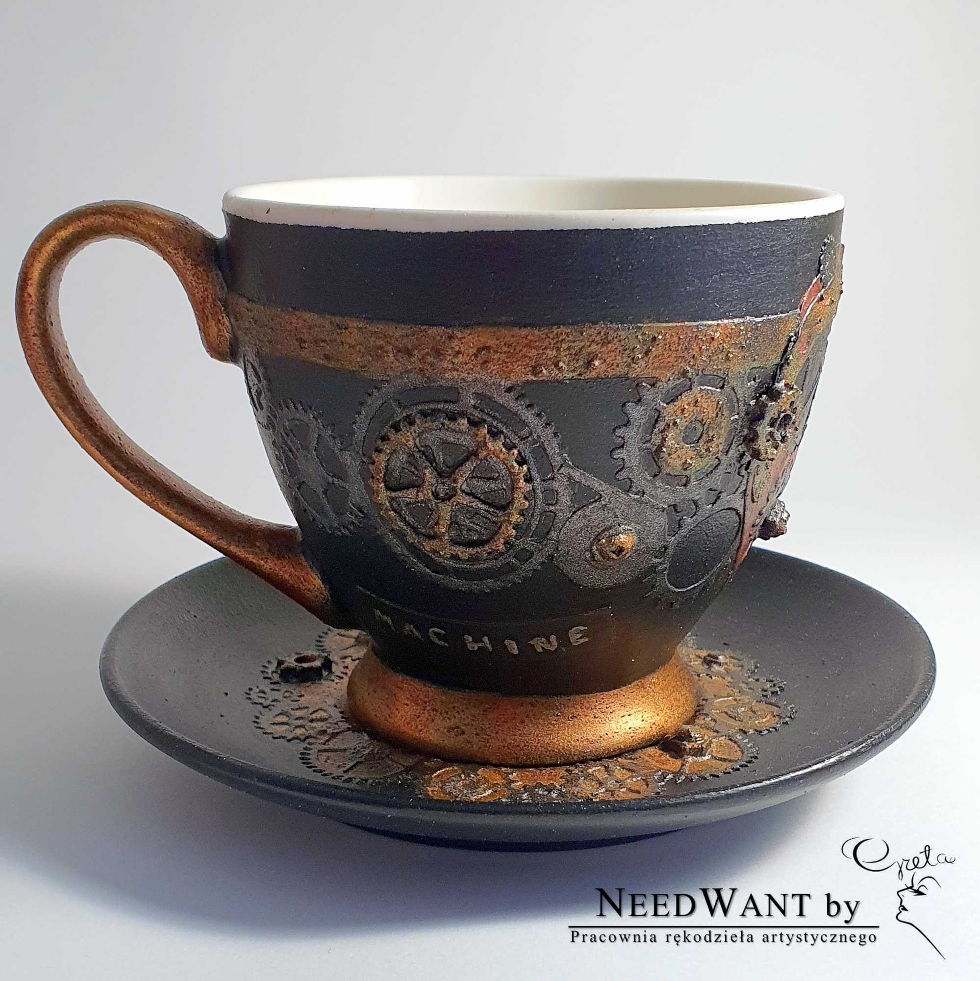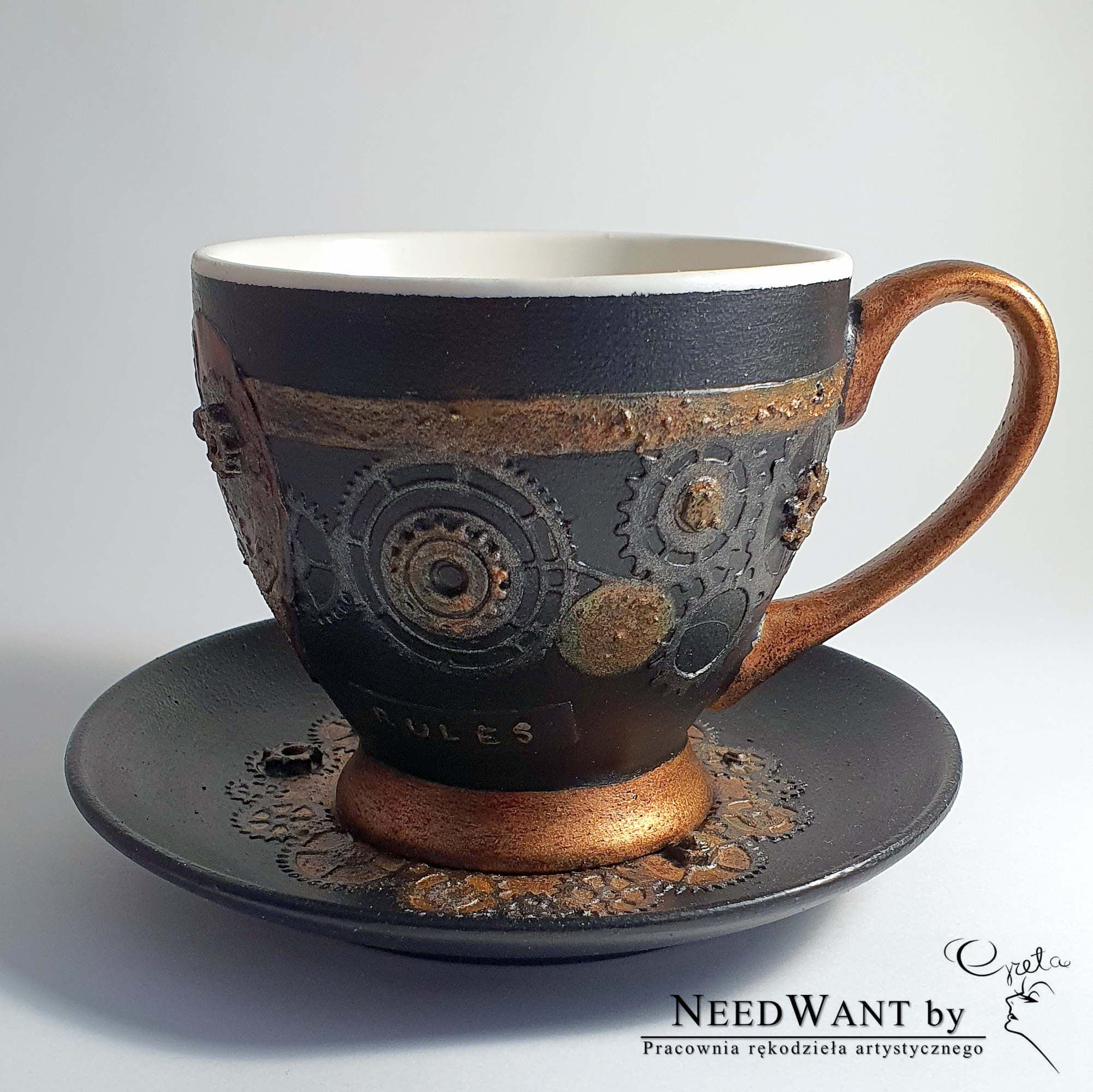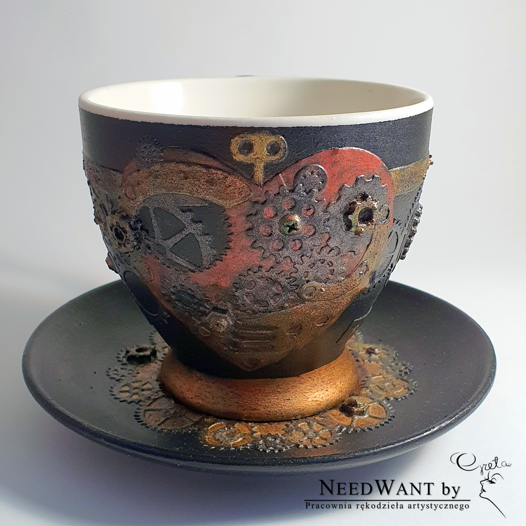 Ręcznie zdobiony kubek z talerzykiem, inspirowany światem zębatek, mechanizmów i magii czasu.