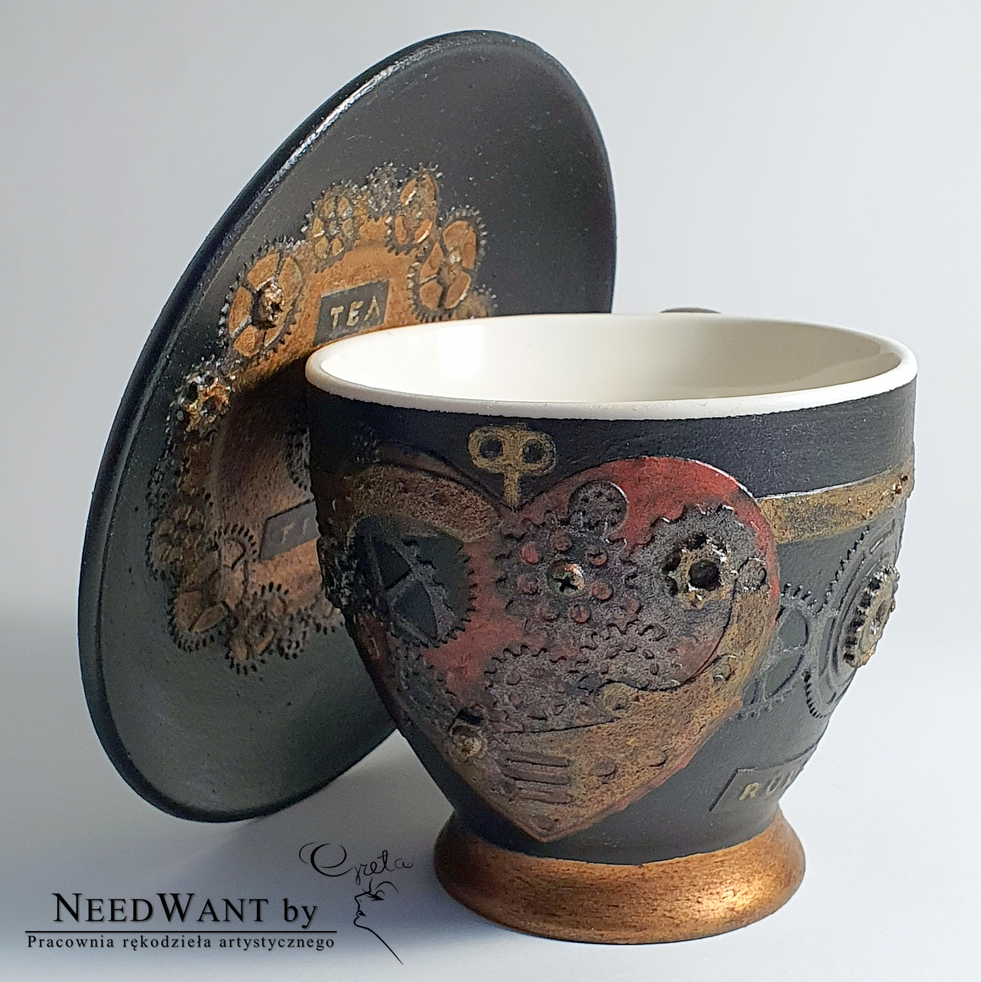 Zestaw Tea time – Machine rules łączy industrialną surowość steampunku z magią codziennego rytuału. Rękodzieło z duszą, które przypomina, że nawet maszyny potrafią zatrzymać się na chwilę — by delektować się smakiem spokoju.